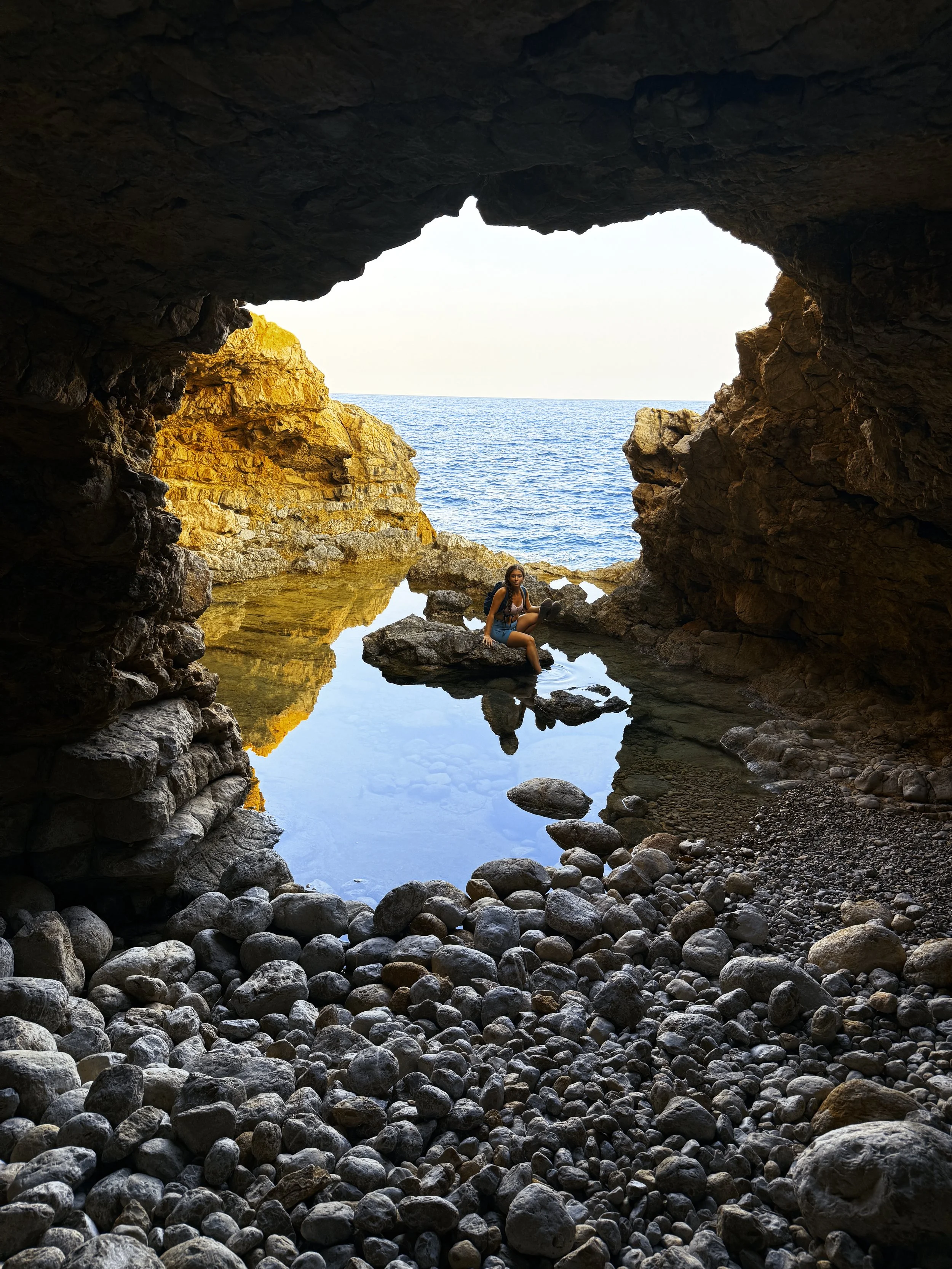A unique, wild, and photogenic spot near central Ibiza, where the sea crashes in and the light creates one-of-a-kind shapes.